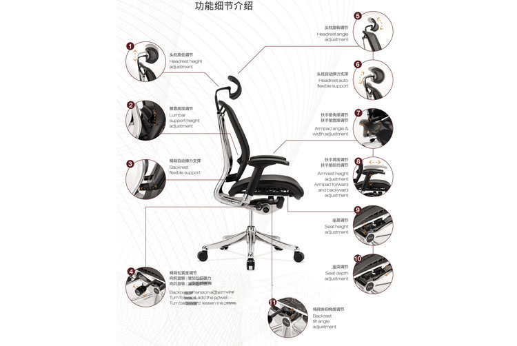 頭枕高度、角度以及自動彈力支撐調節(jié):自主研發(fā)線控底盤,可選擇記憶鎖定或角度速度:背墊高度調節(jié)、椅背彈力支撐、后仰角度調節(jié)、人性化后仰松緊度調節(jié):座高、座深調節(jié):4D無按鈕扶手調節(jié)(高低、前后、左右、角度)
